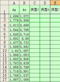 用户数据输入在工作表的左侧,可同时输入5组数据,单组数据最多允许65500(受Excel功能的限制)。分组数据名放在每组(列)的第一行,分析数据自上而下输入,中间不允许有空格(如右图)。