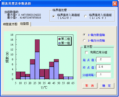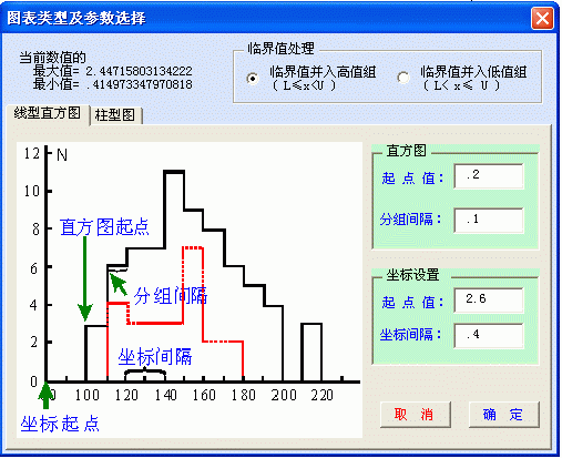 按钮,将会弹出一个对话框,由对话框进行相关参数的设定。对话框是多页的,首先您根据页面标签选择页面(直方图的类型),然后根据对话框上部的统计值(最大值和最小值)来设定您的分组参数。不同类型的直方图的绘图参数略不同。