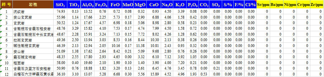 兰色背景部分(Cl前面的元素及氧化物)单位为%,黄色背景部分(Sr后面的元素)单位为ppm,SO3和S是不同相态的硫,前者形成硬石膏,后者生成黄铁矿。