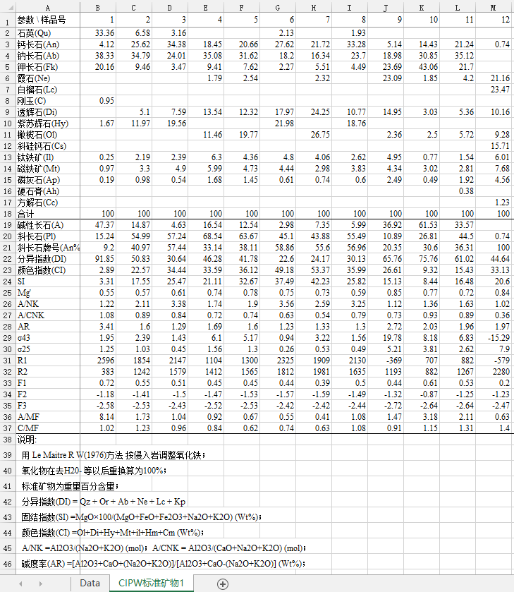 表中Mg'是类似于镁指数(Mg#)的一个参数,但该“镁指数”不是用原始化学组成计算的,是在计算了副矿物后计算的。在论文中的图1(CIPW标准矿物计算流程图)中的说明。
