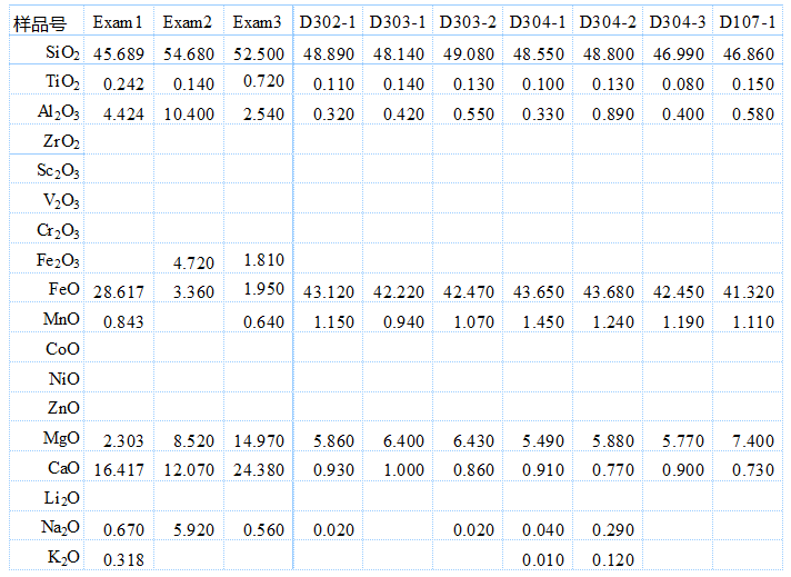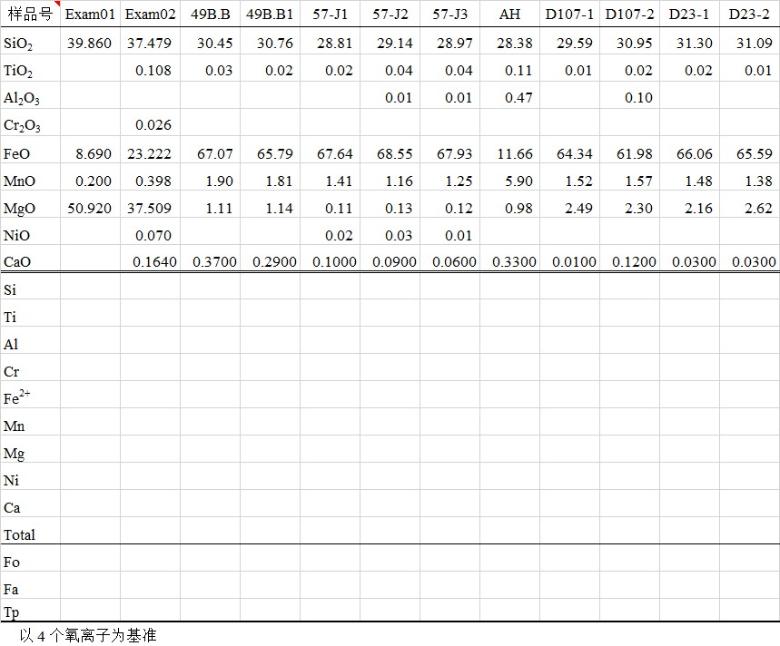 当数据准备好后,点击“橄榄石”浮动工具条中的“橄榄石晶体化学式计算”按钮 开始计算 即可完成全部计算。计算结果保存在您的分析结果数据下方,并以双线与分析数据隔开。 计算结果如下: