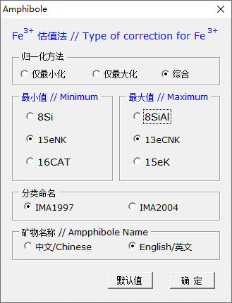 由于角闪石中的铁有三价铁(Fe3+)和二价铁(Fe2+)之分,并且两者通常是共存的。由于当前单矿物分析多采用电子探针法,而电子探针是无法区分铁的价态的,通常是以(FeO)形式给出结果,因此需要对铁进行必要的调整。Fe3+的估计方法有很多,其中有最小值(尽可能将Fe分配给Fe2+)和最大值法(尽可能将Fe分配给Fe3+),这里最大值法和最小值法各设置了三种,你可以选择其中的一种调整方法,也可以选择综合方法。选择综合方法后,会根据选择的最大值法和最小值法各自的计算结果,然后计算其平均值。作者认这,这种方法相对来说效果比较好,因此设置为默认值。