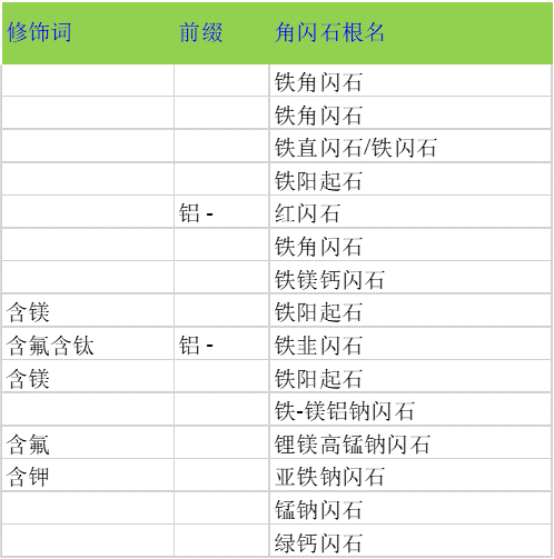 在完成角闪石化学结构式计算后,软件还设置的角闪石的自动分类命名功能,可以给出根名、前缀和修饰词,如下图所示。分类命名的结果放置在氧化物数据后面。